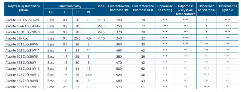 Stosowane stopy i gatunki materiałów